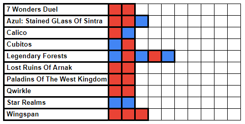 As soon as we met in person in 2020, we started playing games, and recording the stats on the BGStats app. Due to the Lockdowns, it was mostly just the two of us, so we had a little side challenge going of who would win the most games by the end of the year.