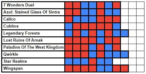However, I was definitely found wanting in 7 WONDERS DUEL and WINGSPAN, and I’ve requested my recent play of PALANDINS OF THE WEST KINGDOM be striken from the records, it was so bad.