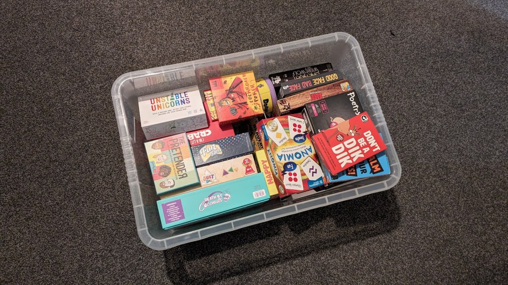 Of course with our large collection of board games you’d think we’d have the event covered. But games, especially those over a four player count, were missing. So over the last ten months, purchases were made, and a nice little collection of games for the wedding guests has grown nicely.