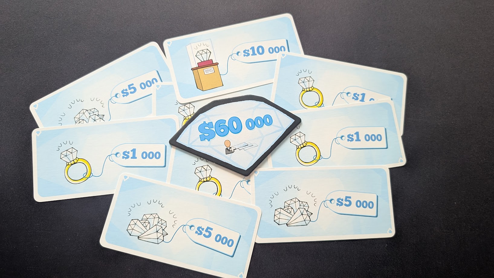 Diamonds are worth varying amounts of money but come with a majority bonus. The person who has the most diamonds at the end of the game gets the big diamond worth a not-to-be-scoffed at $60,000.