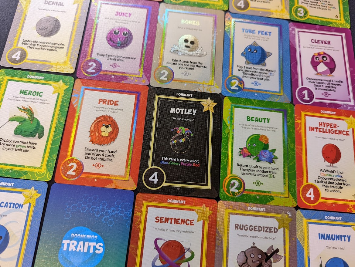 One thing I see when designers go all in on a theme is the need to bring a whole bunch of key words to the rulebooks. DOOMLINGS is one such game. Words are flung around in the rules like Trait, Stable, Gene Pool, and it makes teaching the game to non gamers a little tougher without first translating all the terms to their core label. I’m not saying it’s impossible, but in my experience playing the game with gamers and non gamers, I’ve seen those not of the hobby struggle a little on their first play.