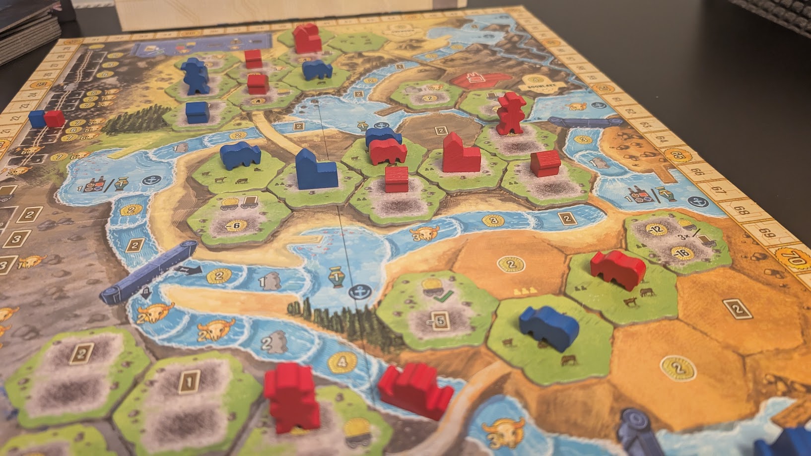 Speaking of resources, things are done a little differenly in BOONLAKE. You don’t have piles of resource cubes scattered around your table, shuffling back and forth between your player board and those handy 3D printed component trays.