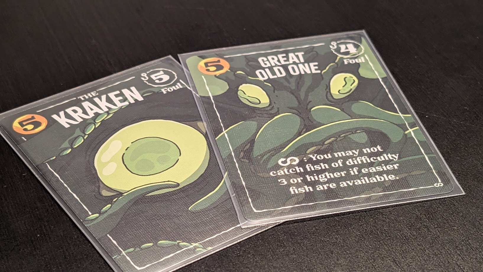 The first, LINGERING REMORSE, adds six new cards, each of which brings an ongoing abilitiy as opposed to a one use only power. These add things like limiting the size of fish you can catch to acting like a shield should an opponent target one of your proze catches. In my opinion, it’s a must have; we don’t play without it now. It just adds a little more meat to the games bones and extends the playtime a few more minutes.