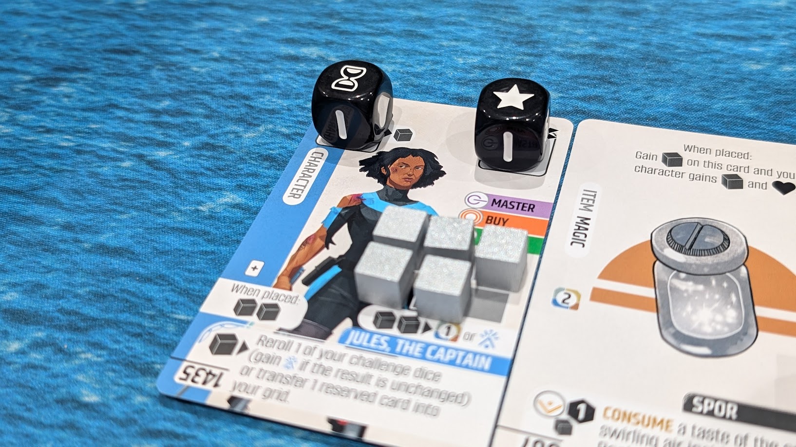 When you pick an action, another player (unless you’re playing solo) will read out a sentence based on your location and choice, and tell you the challenge rating. Effectivly, how many of the blasck dice you’ll need to roll. You can use skill tokens that match the colour of the skill you’re testing. Then you roll and assign these dice to slots all around the play area.